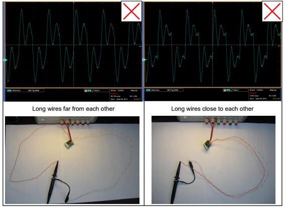 在高低温测试中,工程师发现使用延长线连接探头是方便的。这种方法具有几个缺点,包括来自相邻电路的噪声拾取(参见第3.4节),以及环路的大的自感,导致带宽减小,振铃,过冲或欠冲。当线路移动时,环路的区域会发生变化,从而改变波形的形状。图3.4说明了使用22英寸导线捕获的波形,其中两根不同的导线位置显示出显着的过冲和下冲。如果信号频率接近导线/探头共振频率,波形可能会出现正弦波,振幅超过电源轨。