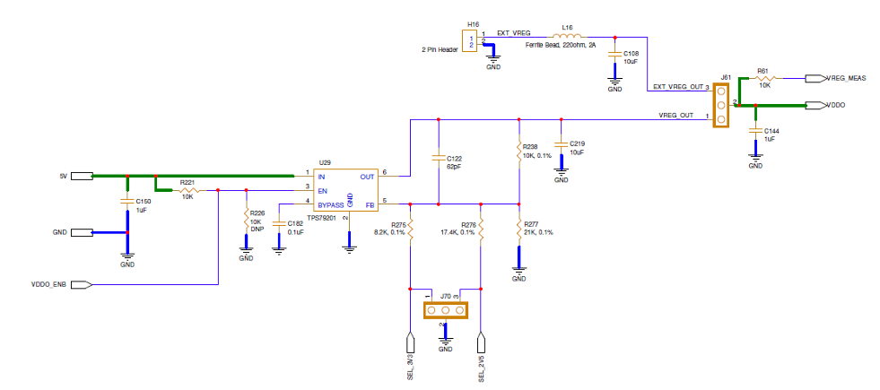 注:要更改 LDO 输出电源电压,请将图 5 中相应的跳线(如 J70)连接到以下设置: